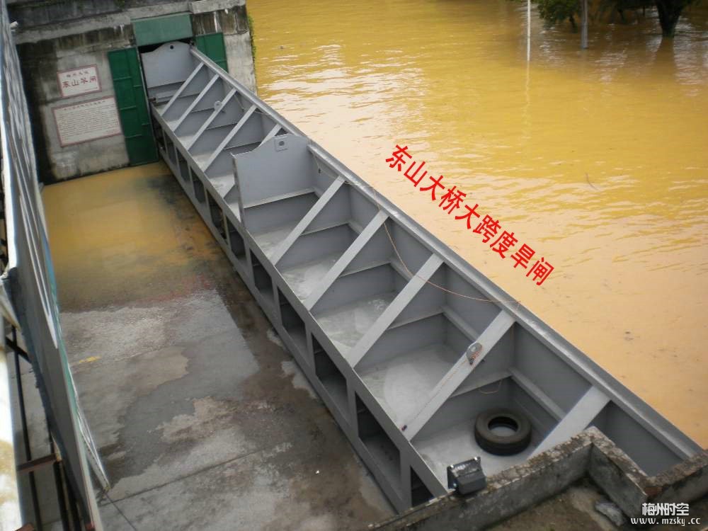東山大橋旱閘閘門孔口尺寸為22m×3.7m(寬×高),閘門底檻高程77.21m(珠基,下同)。屬超大跨度的旱閘工程。其設(shè)計(jì)、制造、運(yùn)輸和安裝的技術(shù)要求高。由我公司承建,該工程于2006年初動(dòng)工,經(jīng)過半年緊張施工,在各參建單位的共同努力下,于2006年6月11日一次整體吊裝成功。2007年度被省水利學(xué)會(huì)評為科學(xué)技術(shù)三等獎(jiǎng);2008年度獲梅州市科技進(jìn)步三等獎(jiǎng)。